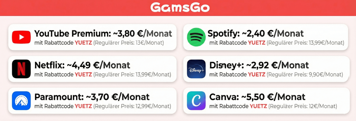 💡 Vorab ein alternativer Tipp: Anstatt VPN-Tricks empfehle ich mittlerweile GamsGo ↓. Über diesen Anbieter lässt sich YouTube Premium bereits ab 3,80 € pro Monat ↓ mit dem eigenen bestehenden YouTube-Konto abonnieren – legal, ohne Sperren und ohne Aufwand.